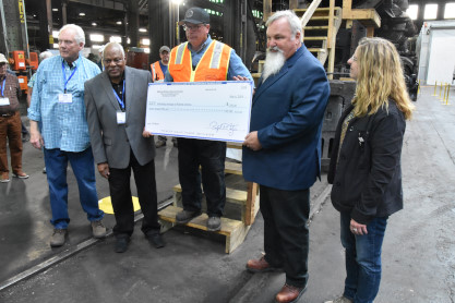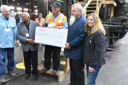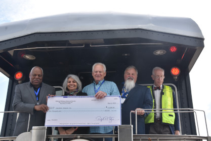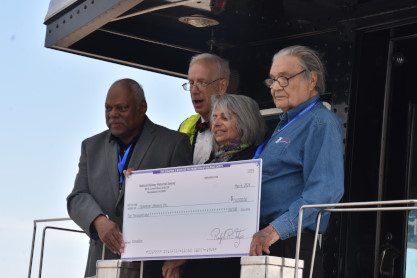 A $10,000 cheque was presented by Tony White, President of the NRHS to Operation Lifesaver, Iowa Interstate's non-profit organization of choice. This represented the donation of ticket sale proceeds from all who attended the 2024 Spring Conference since the railroad does not run passenger trains. Left to right: Tony White, Rachel Maleh (Executive Director of Operation Lifesaver Inc.), Eric Fogg (Board member and conference co-organizer) Mike Yuhas (conference co-organizer) and Henry Posner III (Chairman, Railroad Development Corporation).