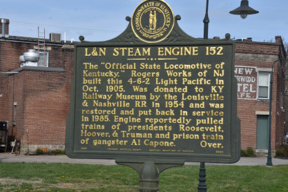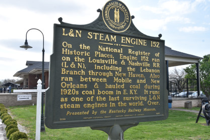 L&N steam engine 152 historical marker boards at the Kentucky Railroad Museum. From here we drove US 316, partially on the Bluegrass Parkway, to US 62 to Bloomfield and in town, found what we were looking for.
