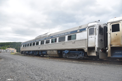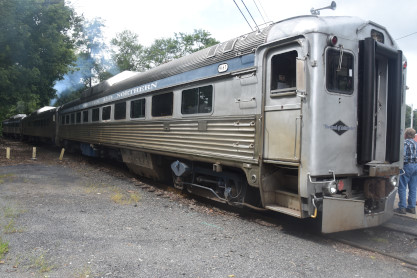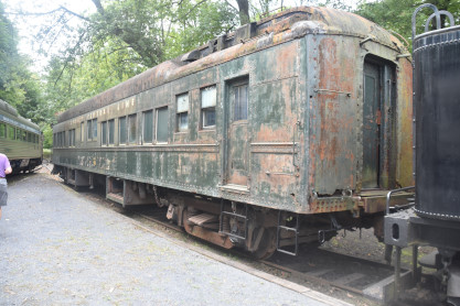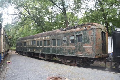 Central of New Jersey observation car 98 built by Harlan & Hollingsworth in 1914. The car was acquired by the Wanamaker, Kempton & Southern around October 1966. This car was not purchased by the railroad directly. Instead, four men from within the organization each chipped in $200 to cover the car's $800 purchase price. Motivation for the purchase was to provide the public with "something new" in 1967. Number 98 was moved to the south end of the back track behind the station. The back track or "museum track" was home to an collection of static displays and other attractions. This collection included 0-4-0 Cooke locomotive 3 at the north end of the track followed by LNE caboose 512, Atlantic City car 72, Baltimore and Ohio coach 4111 and then Central of New Jersey 98. The collection was called the Museum Train and was run by a separate non-profit organization called the Wanamaker, Kempton & Southern Rail Road and Historical Foundation. They planned to call 98 the "Mountain Queen" and had some grand restoration plans including a Royal Purple paint job. But the Foundation appears to have fizzled out with the railroad's closure at the end of 1968.