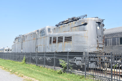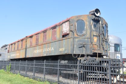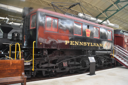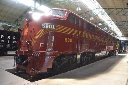 Pennsylvania Railroad E7A 5901, built by Electro-Motive Division in 1945. Due to be scrapped shortly after retirement, quick thinking on the part of railroad employees saved the locomotive, hiding it for a time in an abandoned section of the Harrisburg roundhouse. The Pennsylvania Historical and Museum Commission raised the $20,000 scrap value to purchase it in 1976. The 5901 and sister engine 5900 were the first diesel-electric passenger locomotives built for and delivered to the Pennsylvania Railroad.