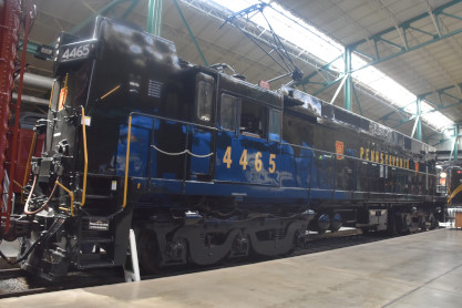 Pennsylvania Railroad E44 4465 built by General Electric in 1963. Referring to its pair of three-axle trucks and boxy carbody, train crews often called the E44's "bricks". The unit served the PRR in freight service for five years before becoming part of Penn Central and finally Conrail. Amtrak considered using the big electric for maintenance-of-way service on the Northeast Corridor until newer federal regulations addressing the use and disposal of polychlorinated biphenyl (PCBs), a toxic chemical used to cool the transformer, made its operation cost prohibitive. This sole unit was officially turned over to the Railroad Museum of Pennsylvania on April 27, 1991 and was the last electric locomotive built for the Pennsylvania Railroad.