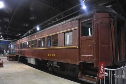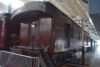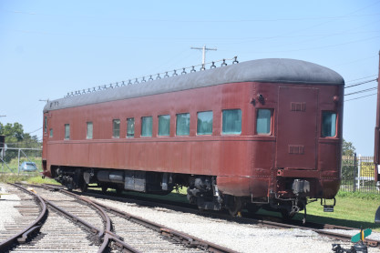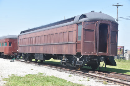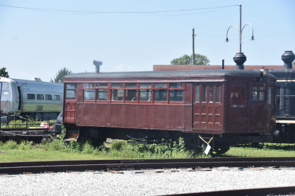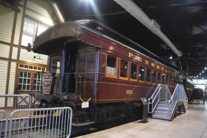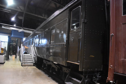 Pennsylvania Railroad coach 1650, built by the railroad in 1908. These cars were experimental prototypes built to meet the new demands for all-steel fire-resistant cars. This desire for all-steel cars was the result of the new tunnels built under the Hudson River into New York City. The thought of an accident occurring in the long tunnels with wood cars lit by flame was a terrifying prospect; so safer, more fire-resistant cars were a necessity for the PRR. These prototype builds had reversible seat backs for quick change of directions, electric lighting, steam heat from the locomotive, mens' and ladies restrooms and drinking water dispensers. These cars laid the ground work for the future modern PRR coach cars and are very unique pieces to the Museum.
