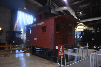 Lehigh Valley bobber caboose 9606, built by the railroad in 1890 and retired 1937. The caboose served as the conductor's office where he kept track of the train's paperwork, including its freight shipments. The car also provided accommodations for long journeys and nights away from home. The conductor often shared this office with a brakeman who assisted in throwing switches, coupling cars and protecting the end of the train.
