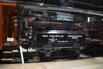 Pennsylvania Railroad test car 490398, built by the railroad in 1961. Because railroads often billed clients on the tonnage of goods handled, it was necessary to have accurate scales built on special sidings. Scales needed to be calibrated on a regular basis. Specially-designed cars were built to maintain a fixed weight. They were built of metal to avoid splintering and absorption of humidity. Unnecessary shelves and ridges were eliminated, and even air brakes were omitted to avoid variance in weight.