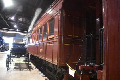 Pennsylvania Railroad business car 3556, built by the railroad in 1886. The late 19th century passenger train featured many elegant details: stained glass clerestory windows, golden oak panelling, silver-plated chandeliers and rich, red plush seat cushions. 3556 also had toilet facilities and a "brass spigot" connected to a water tank for drinking water. Despite their opulence, however, these wooden cars were always a safety hazard. The impact from train collisions could cause an engine to "telescope" another coach from the rear, crushing passengers and upsetting hot stoves, setting the cars ablaze. The development of steel body passenger cars in the early 20th century made train travel much safer and the 3556 was replaced by an all-steel passenger coach.