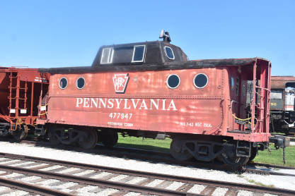 Pennsylvania Railroad caboose 477947, built by the railroad in 1942 and retired in 1985. World War II put great stress on America's railroads with the need to move more freight and passengers than ever before. With the entire economy turned toward wartime production, railroads had to use readily available materials to build new rolling stock. This car provides a clear example with its four porthole windows on each side, making use of glass manufactured for battleships.
