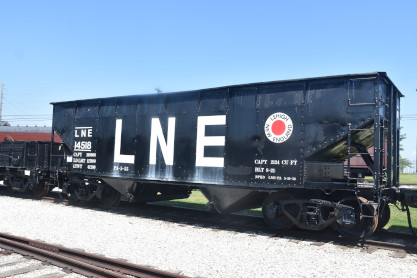 Leigh and New England two-bay hopper 14518, built by American Car and Foundry Company in 1952 and retired in 1959. From the 1920's to the 1950's, hopper cars like this one carried most coal, stone and sand. The typical car was 34 feet long, had two hopper bays on the floor and held 50 tons of coal. This car has its structural supports on the inside of the steel sheathing, allowing for slightly greater capacity.