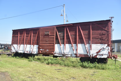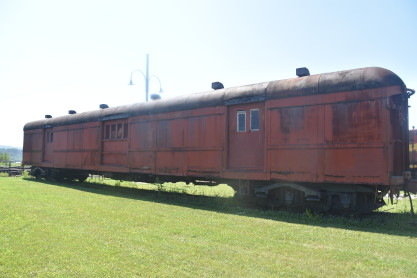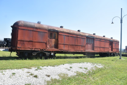 Pennsylvania Railroad horse express 90014 "Saratoga Springs", built in 1928. It was acquired by Juniata Terminal Company from Conrail in 1985, which had converted it to maintenance-of-way power car PRR 490014 at Renovo. It donated it to the State sometime in the early 1990's.