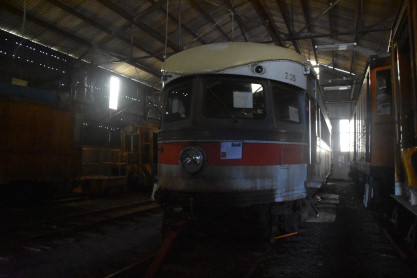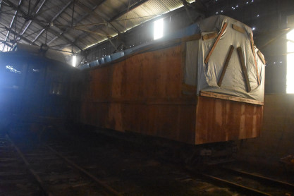 York Railways Company rare curved-side streetcar 163 built by Brill in 1924. The most ambitious restoration project our museum has undertaken to date is York Railways 163. Another trolley builder, the Cincinnati Car Company, had a patent on the curved-side car. Brill built five curved-side cars for York Railways and in doing so, infringed on the patent. Cincinnati sued Brill. Consequently, these five curved-side cars were the only ones built by Brill. York 163 is the only preserved and operable trolley from the York Railways system, which stopped all streetcar operations on February 4, 1939. It was sold to be used as a summer home along Conewago creek north of York and the body survived there until 1972, when Hurricane Agnes completely flooded the car, knocking it off its foundation. The owners no longer wanted the car and donated the body to the museum.