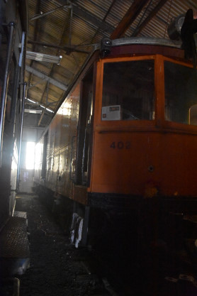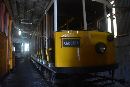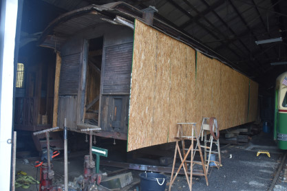 When built, Car 12 used a unique, single "Robinson-Radial" truck with six wheels. Around 1905, Car 12 was fitted with a pair of four wheel trucks, converting it into a double truck car. Declining ridership on the Valley Railways system left a need for fewer cars and it was removed from service in 1923. The trucks were used under another car and the body was tucked away in the Carlisle trolley barn until it was sold for $25 in 1930. Like several other trolleys in our collection, Car 12 was used as a summer home from 1932 until we acquired it. It was located northwest of Plainfield, Pennsylvania by one of our members in 1983 and moved to the museum in 1990, being the first car to be placed inside our new Carbarn Two, protected from the weather. For the first time in 74 years, Car 12 has been placed on wheels to permit movement on the museum's track, which is a temporary measure while a world-wide search continues for the proper trucks suitable for use under the car. Like other former trolley car summer homes, this car will take many thousands of hours and dollars to return to its former glory.
