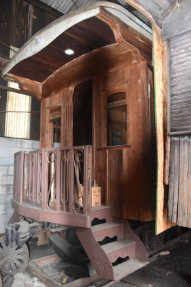 Harrisburg Railways wooden semi-convertible 710 built by Brill in 1913. This is an unusual car since it was constructed with an arch roof and a semi-convertible window pattern. The windows of this car slide up into the roof of the car, as they do in Porto Cars 172 and 249, both operating at the museum. Car 710 was in operation until the end of trolley service in Harrisburg on July 15, 1939. It was quite common for old trolley bodies to be sold and used as summer homes, sheds or club houses. For 47 years, 710 was used as a summer home near Mt. Holly Springs, Pennsylvania. After many years in Mt. Holly Springs, the car's owner passed away and the family no longer wanted the car. A building had been built around the entire car to provide additional living space during its years as a summer home. Our volunteers cleared the building away from car 710 and moved it to our site.