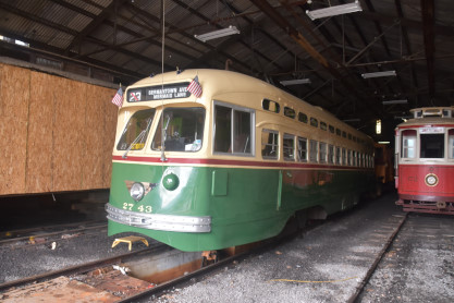 Philadelphia Transportation Company city & suburban PCC car 2743 built by St. Louis Car Company in 1947. During the 1930's, transit companies were in competition with the private automobile since people were using their own automobiles as they were affordable. The electric railway industry commissioned a Presidents’ Conference Committee to design a new standard trolley to increase ridership. The PCC, named for the Presidents’ Conference Committee, saved many transit companies from early abandonment.