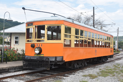 Johnstown Traction Company double-truck Birney "safety car" 311 built by Wason in 1922. It was part of an order of cars for the City of Bangor, Maine, where it operated as number 14. It was sold to the Johnstown Traction Company in 1941 and served that city well, running until the end of service in 1960. Car 311 was the last Birney type car to be operated in any United States city on a regular schedule and was chartered repeatedly by trolley fans in the 1950's, as it was a favorite car of many.