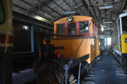 Scranton Transit Sweeper single-truck snow sweeper 107, a one-of-a-kind vehicle built by Chicago and Joliet Electric Railway in 1910 and is a four-wheeled car with rotating brooms at both ends. It is a "steeple cab" design with operator controls only in the middle. After the C&JER stopped operations in 1933, it went to Scranton until they stopped operating trolleys on December 18, 1954. Scranton snowsweeper 107 and passenger car 505 were taken to the Rail City museum in Sandy Pond, New York and ultimately to the Magee Transportation Museum in Bloomsburg, Pennsylvania. In 1972, Hurricane Agnes flooded the Magee museum, forcing its closing. Our Museum acquired 107 in 1973 and returned it to operation, having used it many times to clear snow from the museum tracks.
