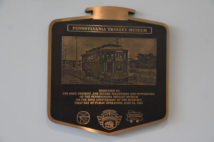 Pennsylvania Trolley Museum plaque dedicated to the volunteers and supporters on the 80th anniversary of the museum's first day of public operation.
