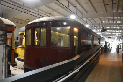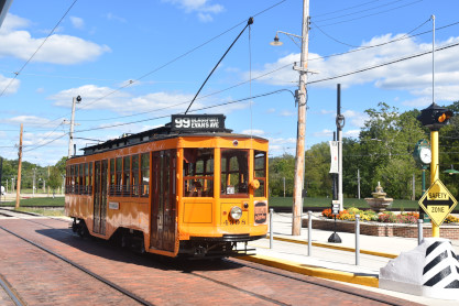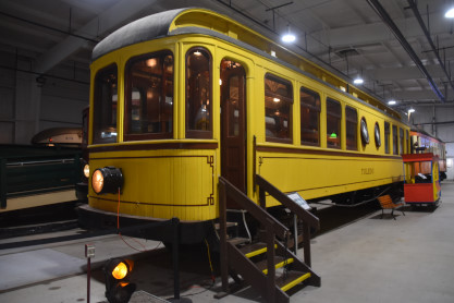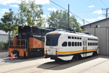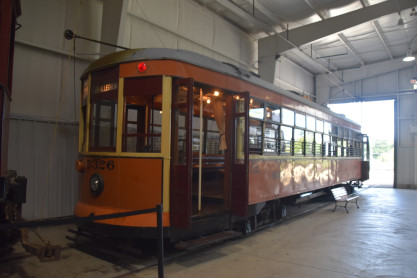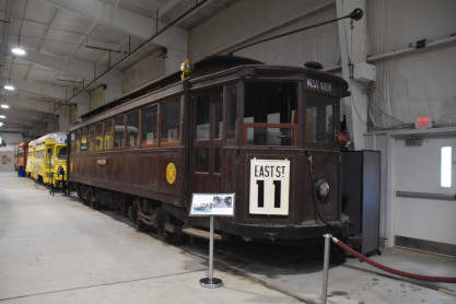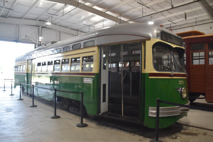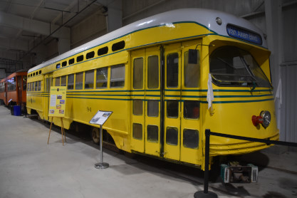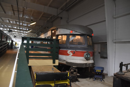 Shaker Heights Rapid Transit 94 built by Pullman Standard Company in 1948. The Cleveland suburb of Shaker Heights was unusual in that its developers included a rapid transit line as part of the original community design. Good transportation to the city, it was felt, would make the neighborhood all that more attractive to prospective land purchasers. The premise has been highly successful and the transit system works splendidly. Ownership was assumed by the City of Shaker Heights in 1944. Twenty-five cars like 94 were purchased four years later to modernize the operation. After over 30 years service, 94 and similar cars were replaced with new vehicles. Several of these Pullman- built PCC cars have been preserved by trolley museums. 94 is the only Pullman-built PCC car in the museum's collection and is it only PCC with General Electric control. After acquisition of the car in 1987 time was spent stripping the exterior paint and priming painting the surfaces and repairing rust holes following several years of outside storage in Cleveland. The painting and body work was restarted in 2016 by a group of volunteers from the Cleveland area. The car is part of the exhibit in the Trolley Display Building.