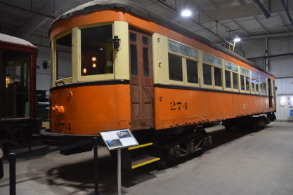 Monongahela West Penn Railway 274 built by Jewett Car Company in 1918. West Virginia had limited streetcar service compared to Pennsylvania. It was confined to the major cities, with Monongahela Valley Traction being the most important company. In 1923, the company was bought by the Pittsburgh-based West Penn System, which also operated trolleys in Wheeling as well as in Western Pennsylvania. Car 274 was modern for its time, featuring all-steel construction and multiple-unit control, and initially served the Fairmont-Clarksburg-Weston route. A large freight door allowed transportation of commodities. In 1937, the car was transferred to the Parkersburg-Marietta division before being retired three years later. Car 274 is a member of the Pennsylvania Trolley Museum's "lived-in" fleet - it served, with a sister car, for more than three decades as a summer cottage in Southeast Ohio before coming to the Museum in 1974.