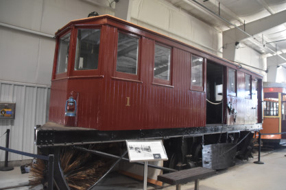 Beaver Valley Traction Company snow sweeper 1 built by McGuire-Cummings in 1918. Beaver Valley Traction and Pittsburgh Railways shared the same parent company. It was delivered at the same time as six similar cars purchased by Pittsburgh Railways for use in Pittsburgh. The car came to Pittsburgh after the Beaver Valley line closed down in the 1930's. It is the only piece of surviving equipment from that company. The basic appearance of the snow sweeper did not change appreciably in the two decades separating the manufacture of M37 and this car. But there were significant structural improvements to this later model, such as the steel frame that supports the body.