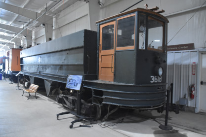 Boston Elevated Railway Company 3618 built by Differential Steel Car Company in 1927 for use in track construction on the streetcar lines of the Boston Elevated Railway in Massachusetts. Its job was to carry ballast to construction sites and then spread the rock on top of the ties so that it can be used to raise and level the track. This hopper dump car is unusual because most electric railway companies used side dump cars for this job. In fact, fewer than ten cars of this type are known to have been built by Difco.