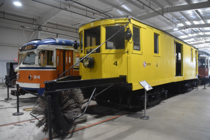 Pennsylvania Trolley Museum snow sweeper 4, ex. Southeastern Pennsylvania Transportation Authority 4 1970-1988, exx. Philadelphia Suburban Transportation 4 1936-1970, nee Philadelphia and West Chester 4 1922-1936 built by McGuire-Cummings in 1922. It was purchased following the terrible winter weather that befell southeastern Pennsylvania in January 1922 when passengers were left stranded along the West Chester line for up to 20 hours while traction crews worked to open the line. The lack of robust snow fighting equipment prompted this car's purchase.