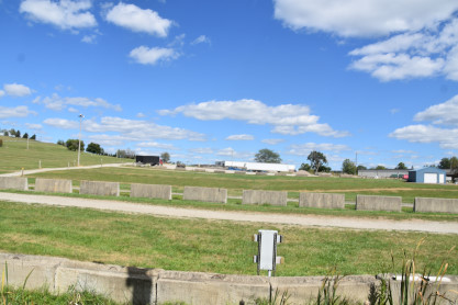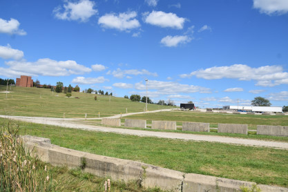 A clock tower and landscaping near the museum building which had been completed and opened in November 2023.