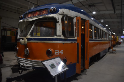 From 1971 until 1977, it was housed through the kindness of Meadowcroft Village. Starting in 1977 it was rebuilt, cosmetically restored and placed on display at Station Square in Pittsburgh. After the sale of Station Square in 2000, it was moved to storage in Stowe Township through the kindness of Frank Fairbanks. It remained there until 2004 when it returned to the museum for display in the Trolley Display Building.Philadelphia Suburban 24 built by St. Louis Car Company in 1949. When the Red Arrow Lines (Philadelphia Suburban Transportation Company) needed additional modern equipment to handle the burgeoning postwar population growth in Philadelphia's western suburbs it turned to St. Louis Car Company. Red Arrow's traditional builder of choice J.G. Brill ceased streetcar production following construction of Brilliners 1-10 in 1941. The fourteen cars they supplied were quite advanced for the day, featuring streamlined bodies of the PCC car but riding on traditional wheelsets and having larger motors for high-speed operation. Little wonder, then, that car 24 (and sister 14, beautifully restored to its 1949 appearance and in service at the Museum) remained in regular operation until new cars were purchased in 1982. Car 24 is the Pennsylvania Trolley Museum's newest streetcar (only the Budd built 1960 subway car is newer).