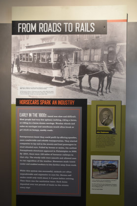 Since being placed on exhibit in the Trolley Display Building, volunteers have done extensive work on the exterior of the car. Part of our exhibit shows reprinted newspaper articles from Philadelphia and Pittsburgh that tell the story of the Smail Family turning a retired streetcar into a home. The wide open interior of the car currently serves as a workshop for the ongoing effort to restore the exterior appearance of the cars.