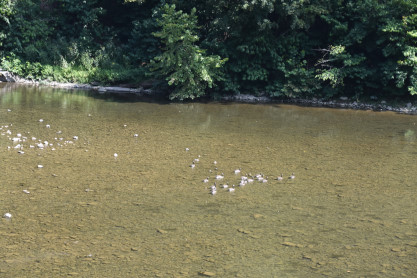 Ducks abound in the water.