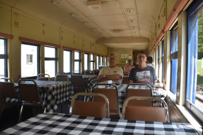 The Trough. Back in our coach, the owner of the South Branch Railroad stopped at our table for a chat.