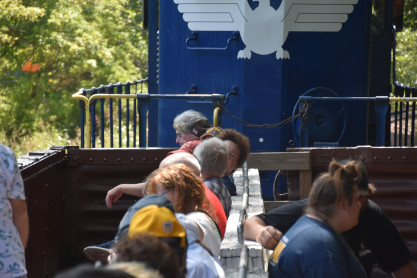 Potomac Eagle Scenic Railroad open car PESX1. Step into the thrill of adventure aboard our open-top gondola, a standout feature of our journey through Trough Canyon. Once used to transport freight, this gondola has been transformed into a comfortable space with benches for passengers to relax and enjoy a 365-degree panoramic view of the stunning canyon landscape and the majestic homes of eagles. Located at the south end of the train, the open-top gondola provides an immersive outdoor experience, allowing you to feel the rush of the wind and the exhilaration of nature's beauty all around you. It is an unforgettable way to connect with the wilderness and experience the full grandeur of Trough Canyon.