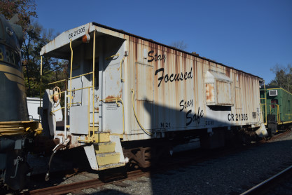 Conrail bay window caboose 21305 built by Fruit Growers Express in 1978 with a slogan on it that reads "Stay Focused, Stay Safe".