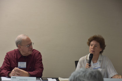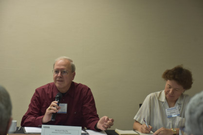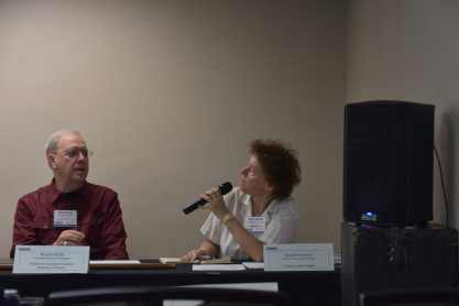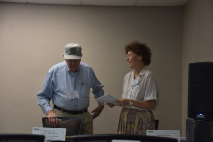 After the plenary session of reports, Elizabeth, in her role as Advisory Council Secretry, prepared the room for the Advisory Council meeting, and shared a light moment with Ron Gawedzinski, National Representative for the St. Louis Chapter.
