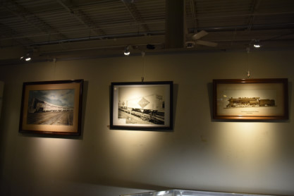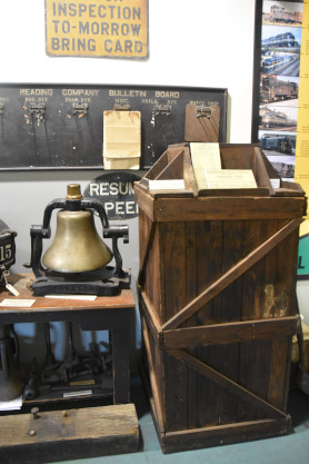 Steam engine headlights, a locomotive bell and a Reading Company bulletin board. We then went outside to view the collection.