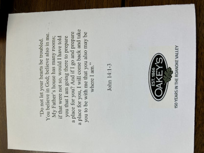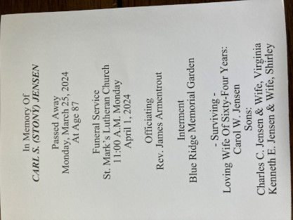 4/1/2024 We arose and went to the International House of Pancakes for breakfast then returned to check e-mail and our usual morning preparations. The funeral did not start until 10:15 and we were two of about fifty people, mostly family and friends, but four National Railway Historical Society members. A very fitting service was led by Reverand James Armentrout with one of Carl's twin brothers, Erik, giving a eulogy about his early life.The funeral program. We decided to join the graveside service so followed many vehicles in a procession to Blue Ridge Memorial Gardens. Carol invited us to join her and the family at the house afterwards and we spent part of the afternoon there. Food had been bought and Elizabeth helped to prepare it for those in attendance. We had a very nice conversation with one of Carl's sons, Ken, and felt honoured to be included to this extent.