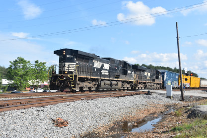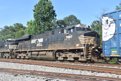 Norfolk Southern D9-44CW 9854 built by General Electric in 1972 and ES44DC 7667 built by General Electric in 1996, came through while we were stopped.