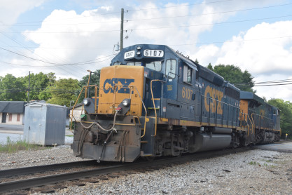 CSX ES44AC-H 3111 built by General Electric in 2013 and GP40-2 6107, ex. CSX 6107, nee Baltimore and Ohio 4208, built by Electro-Motive Division in 1975.