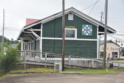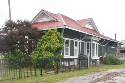 Jasper Louisville and Nashville station built in 1920. The restored long white gabled combination wood depot contains offices. Jasper, the county seat of Pickens County, was incorporated as a town in 1857 and as a city a hundred years later. It was named for William Jasper, a Revolutionary War hero.