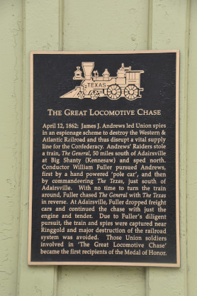 On 12th April 1862, it was commandeered at Big Shanty (now Kennesaw) by Union volunteers who had infiltrated Confederate territory in civilian clothing. Led by James J. Andrews, their goal was to take the train north towards Chattanooga and meet up with the Union's advancing army. Along the way, they would tear up track, sabotage switches, burn bridges and bring down telegraph lines. The train's conductor, William Allen Fuller, and two other men gave chase, first on foot and then by handcar. At Etowah, Fuller commandeered the "Yonah" and continued to Kingston. There, he switched to the "William R. Smith" but, two miles south of Adairsville, the tracks having been lifted by the raiders, Fuller was forced to revert to foot. Arriving at Adairsville, he then took command of the southbound "Texas" and resumed his pursuit.
