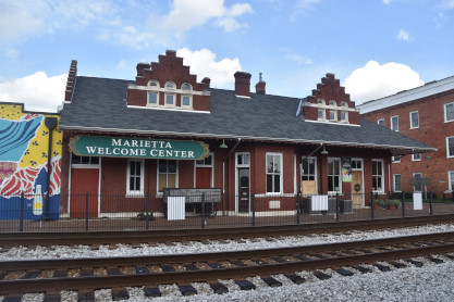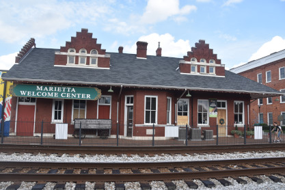 Marietta Western and Atlantic {Nashville, Chattanooga and St Louis} station built in 1864. The red elegant brick combination depot, with additions, serves as the city's welcome center. It was burnt down by General William Tecumesh Sherman in the later years of the Civil War but was rebuilt in 1898. Marrietta is the county seat of Cobb County, selected as the hub for the new Western and Atlantic Railroad and business boomed.