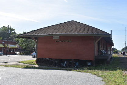 Seaboard Air Line Statham wooden combination station built in 1912 and houses an antique shop. Statham grew from a combination country store and post office owned and operated by Mr. and Mrs. J.C. Statham. The post office was first known as Barbers Creek, then Delay and changed to Statham in 1897. The first depot was built in 1900.