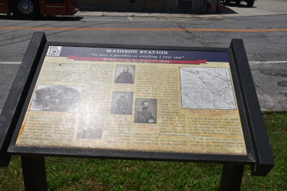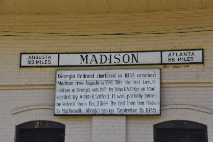 Georgia Railroad Madison combination brick depot built in 1841, which is one of the oldest in the state. The Georgia Railroad was chartered in 1883 and reached Madison from Augusta in 1841. This was the first brick station in Georgia built by John B. Walker on land deeded by Adam B. Saffold. It was partially burned by federal troops on December 3, 1894 but was repaired the following year. The first train from Madison to Marthasville ran on September 15, 1845.