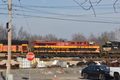 Union Pacifiic SD70ACe 8690 built by Electro-Motive Divison in 2011, Kansas City Southern ES44AC 4796 built by General Electric in 2012 and Kansas City Southern C44-9W 4433, nee BNSF 4910 built by General Electric in 1998, in a light engine move.