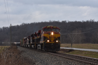 Kansas City Southern de Mexico ES44AC 4878 built by General Elctric in 2016, Kansas City Southern SD70ACe 4191 built in Electro-Motove Divison in 2015, Kansas City Southern AC4400CW 4592 built by General Electric in 1999, Canadian Pacific AC4400CW 9810 built by General Electric in 2004 and Canadian Pacific AC4400CWM 8041:2 built by General Electric in 1995.