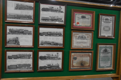Steam engine pictures and railroad stock certificates.