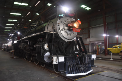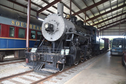 Savannah and Atlanta 4-6-2 750, nee Florida East Coast 80, built by American Locomotive Company in 1910. When the Key West route was abandoned following the 1935 hurricane, FEC had a surplus of power and S&A purchased this unit. It was featured in the films "Biloxi Blues" and "Seabiscuit" and was donated to the museum collection in 1962. 750 hauled its first excursion in 1964 and ran many double headers with Southern 722 from 1970 to 1975. It then started a complete overhaul but did not return to steam until 1983, working for five more years before retiring for good in 1988.