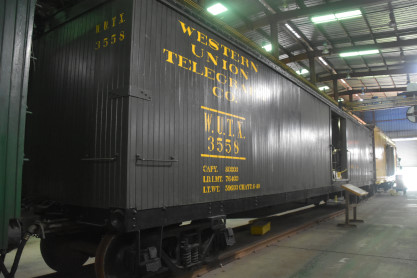 Western Union Telegraph Company wooden tool car 3558 built circa 1930 as part of special Western Union work trains to maintain extensive networks of trackside poles and lines. It was donated in 1966.