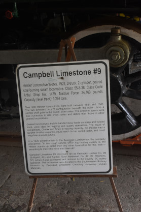 Campbell Limestone 2 truck Heisler 9, ex. Campbell Limestone and Vulcan Materials 9, exx. Carolina Tie & Lumber 9, exxx. Santee River Hardwood Company 9, nee Kentucky Lumber Company 9, built by Heisler in 1923, before being donated to the Atlanta Chapter of the National Railway Historical Society in 1979.