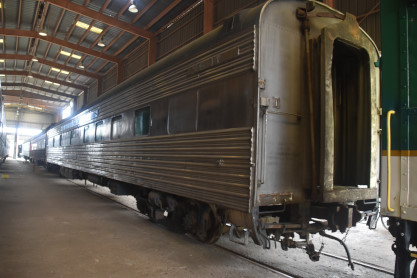Southern Railway dining car 3168 built by Pullman in 1926 with original seating for 36. It was rebuilt in 1948 to accommodate 48-seat cafe-style service. The original kitchen is intact and was donated in 1971.
