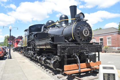 Simpson Timber 3 truck Shay 7, ex. donated to City of Shelton in 1959, exx. Simpson Logging Company 7, nee Phoenix Logging Company 7 at Hoodsport, built by Lima Machine Works in 1924.