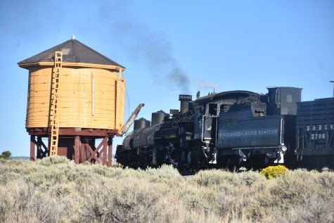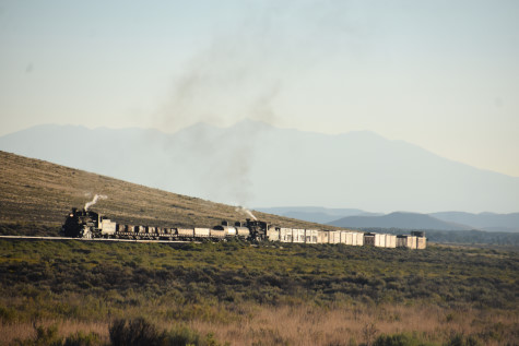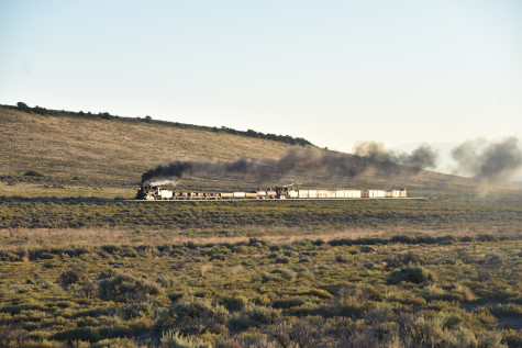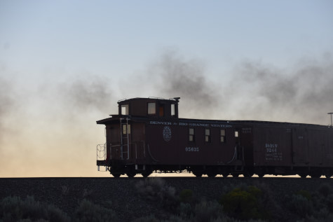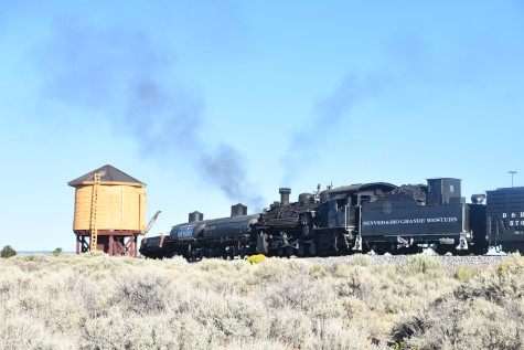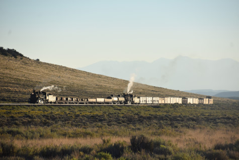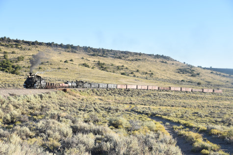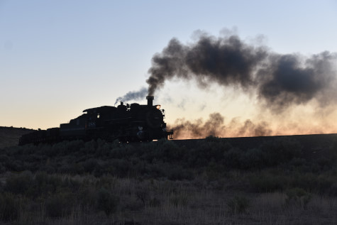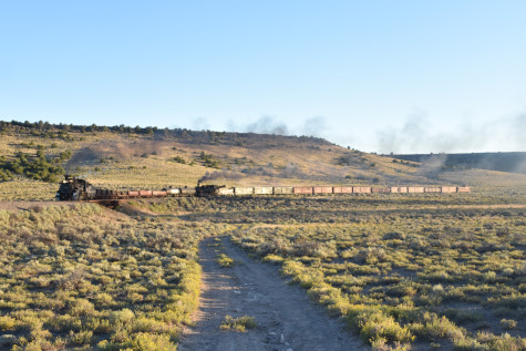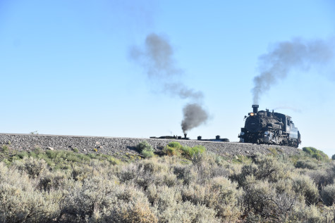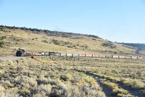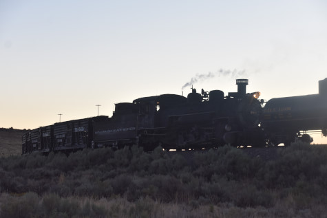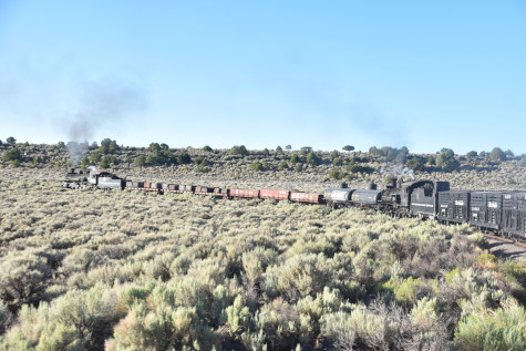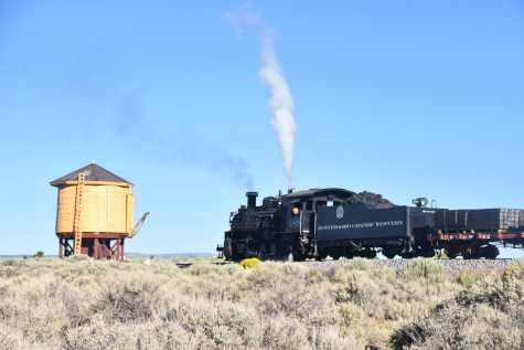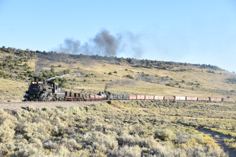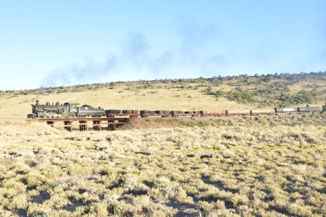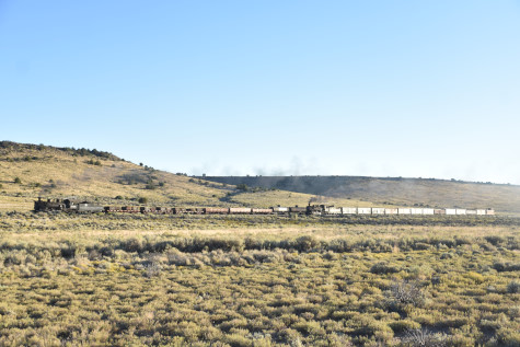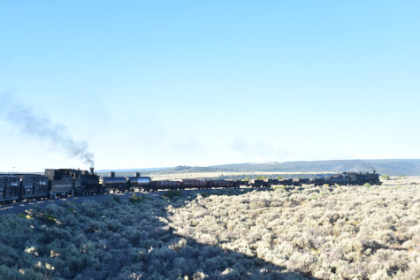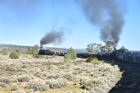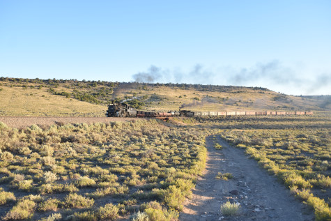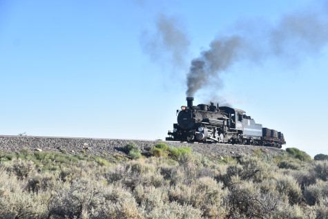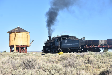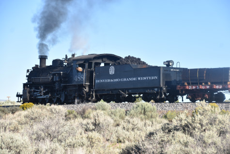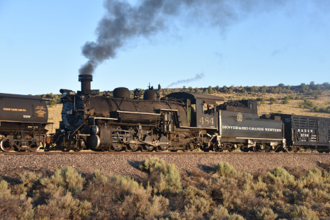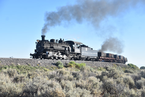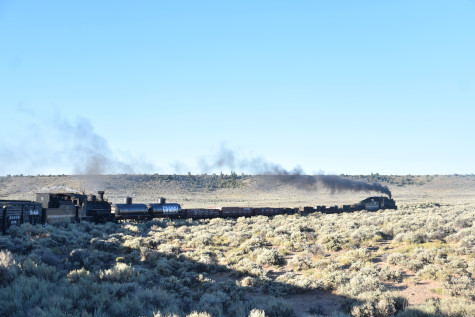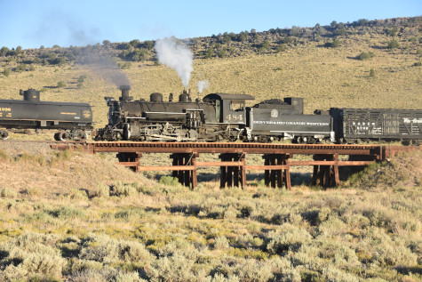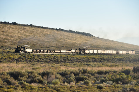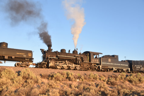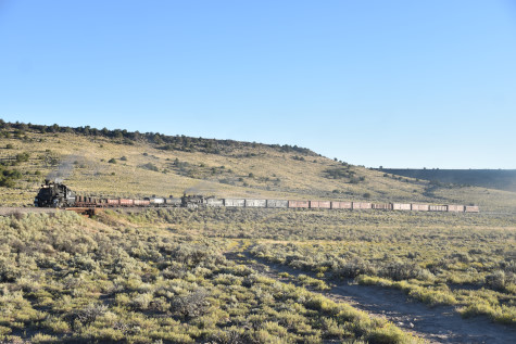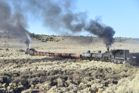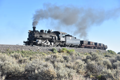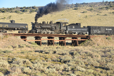 This was the last of the three-day photo charter organized by Dak Dillon in celebration of the 100th anniversary of the K36 locomotives. Today's photo freight would journey through rugged high desert, canyon walls and historic tunnels with the experience of the dramatic transition from high desert to towering rock walls as our K-36 locomotive power through the most diverse terrain on the entire line. This special excursion travelled through steep-walled canyons, navigated two historic tunnels and offered spectacular vistas of the surrounding landscape. For authenticity, the steam locomotives and rolling stock had been lettered "Denver and Rio Grande Western" for these charters.